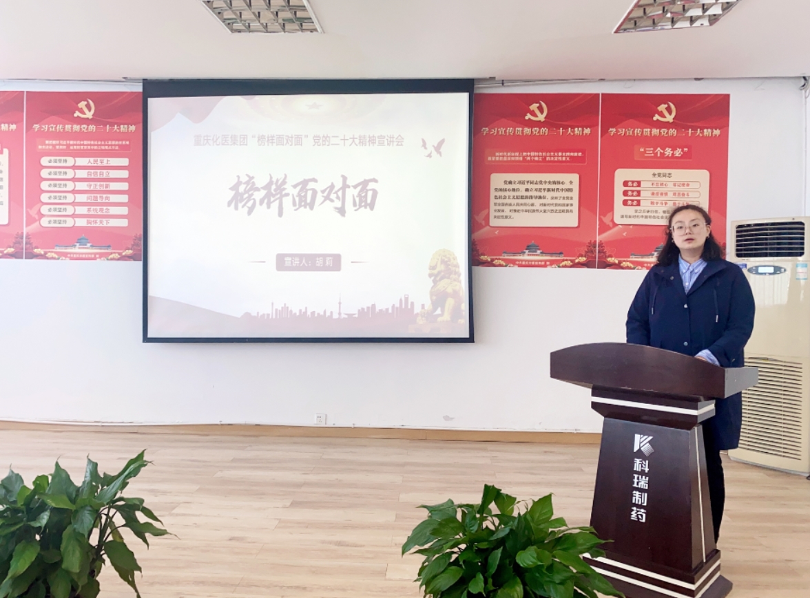 為深入學(xué)習(xí)宣傳貫徹黨的二十大精神,充分發(fā)揮身邊優(yōu)秀典型榜樣力量,扎實推進(jìn)黨的二十大精神在一線基層落地生根,3月28日,重慶化醫(yī)集團“榜樣面對面”黨的二十大精神宣講會在科瑞制藥舉行。