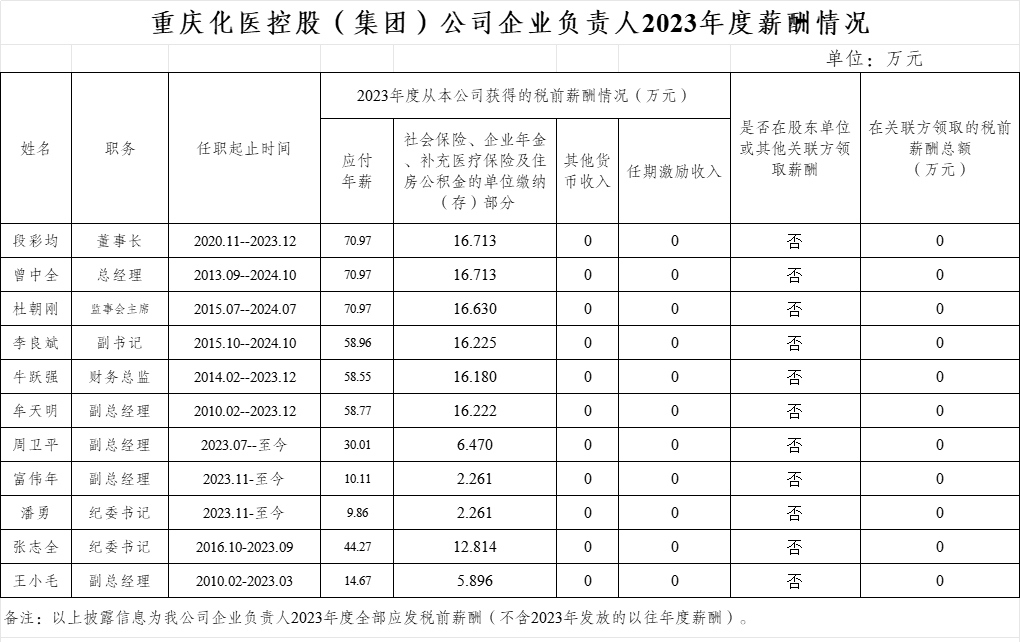重慶化醫(yī)控股(集團)公司企業(yè)負責人2023年度薪酬情況